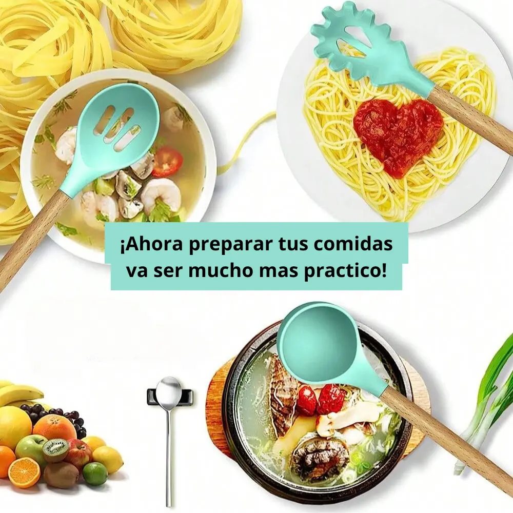 Los mangos de los utensilios son de madera, lo que proporciona un toque cómodo y seguro durante su uso. La silicona utilizada es de alta calidad, resistente al calor y fácil de limpiar. Además, la silicona no raya las ollas y sartenes, lo que garantiza su durabilidad.