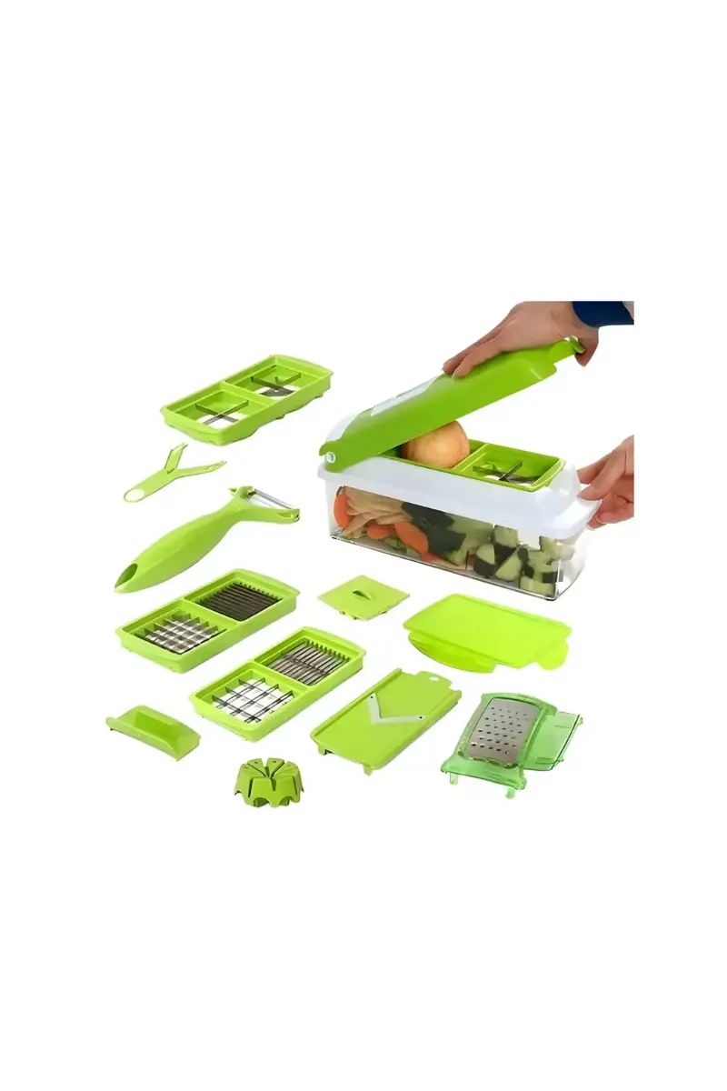 Mandolina multifunción 12 en 1, ideal para cortar, rallar y picar todo tipo de vegetales y frutas en segundos. Incluye 5 cuchillas intercambiables de acero inoxidable para hasta 22 tipos de cortes diferentes: cubos, bastones, rodajas, rallado fino, grueso y más. Viene con recipiente contenedor, pelador y accesorios de seguridad para una preparación fácil y rápida. Perfecta para ahorrar tiempo en la cocina y obtener cortes uniformes.