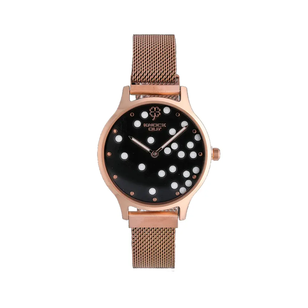 Sofisticado y moderno, este reloj Knock Out combina una elegante malla metálica en tono rose gold con una esfera negra decorada con originales puntos en blanco.