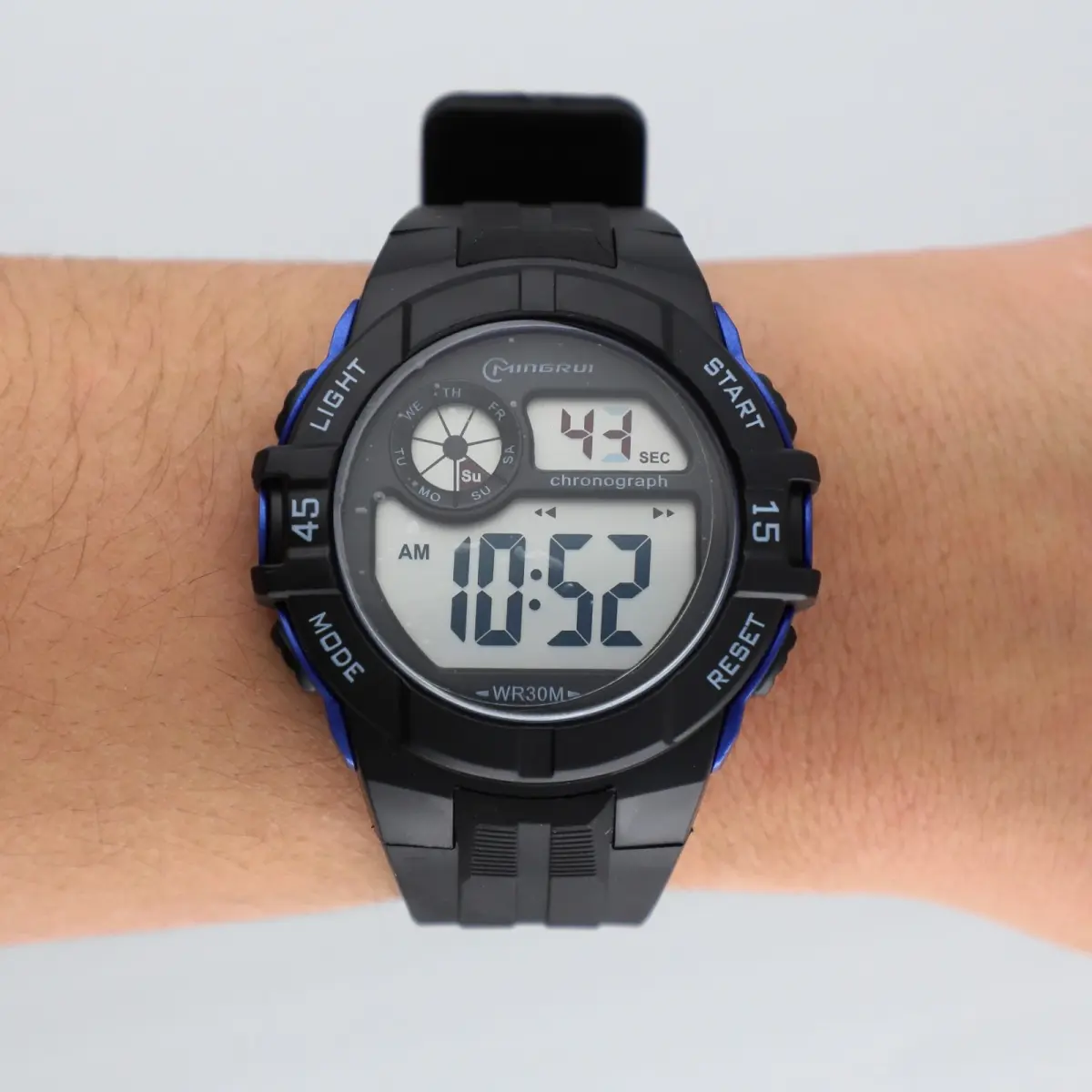 Reloj deportivo digital Mingrui, resistente al agua, ideal para uso diario y actividades al aire libre. Diseño moderno y funcional, con cronómetro, alarma y retroiluminación.